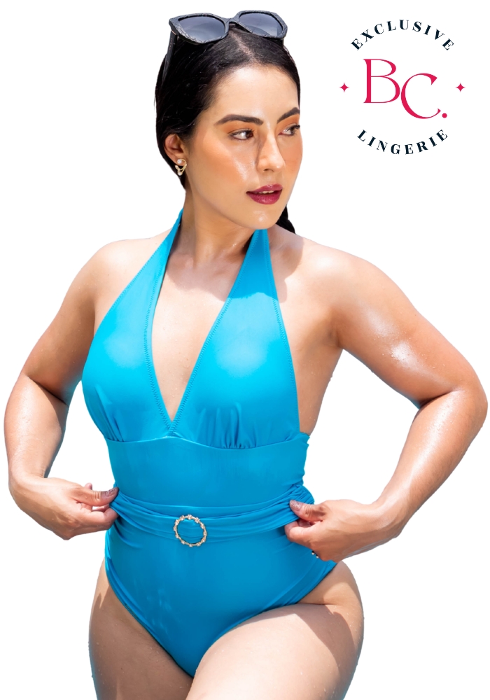 Entero completamente forrado, con copa, drapeado delantero y detalle de correa con detalle de aplicación dorada.