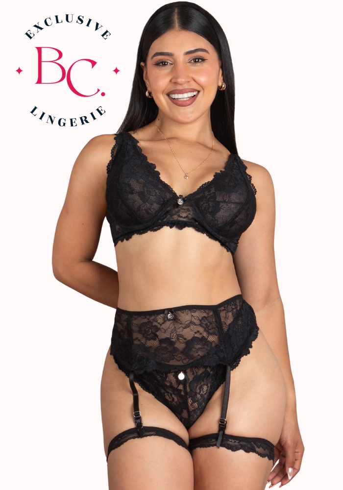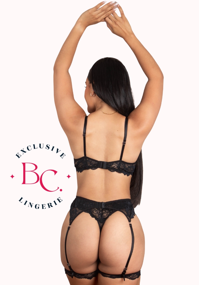 Elaborado en encaje elástico, brasier sin copa prehormada, liguero, trusa hilo y ligas de encaje.