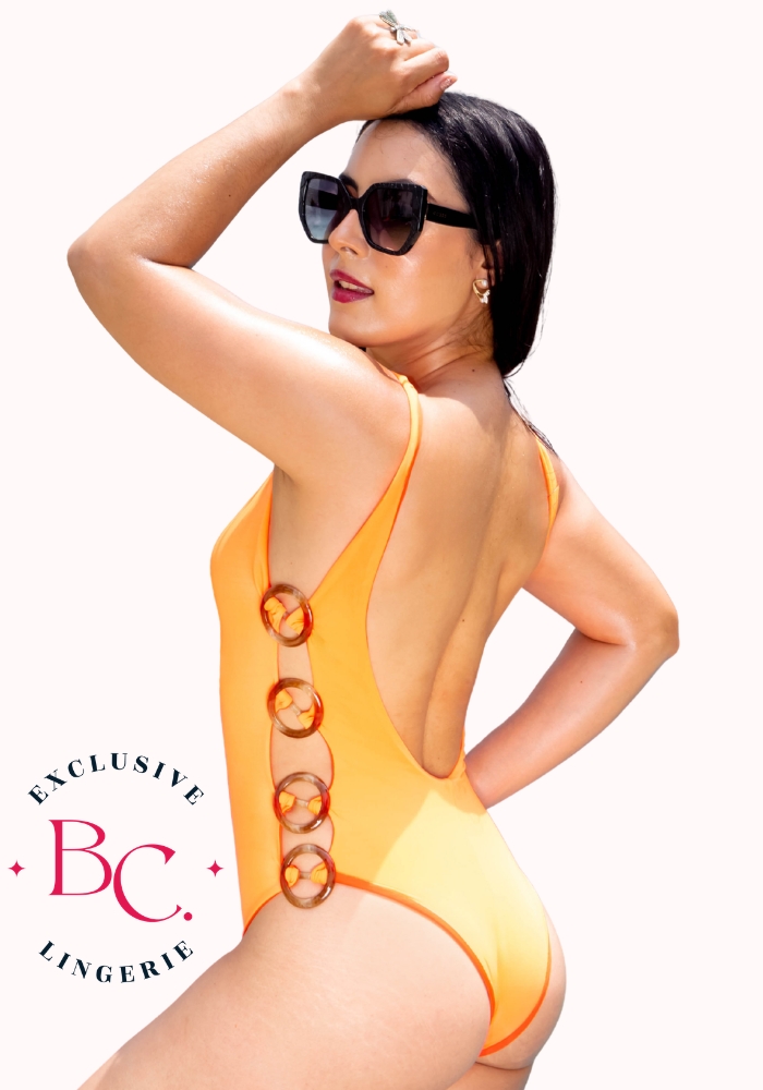 One piece elaborado en licra brasilera completamente forrado sin copa, aros de Carey a los lados.